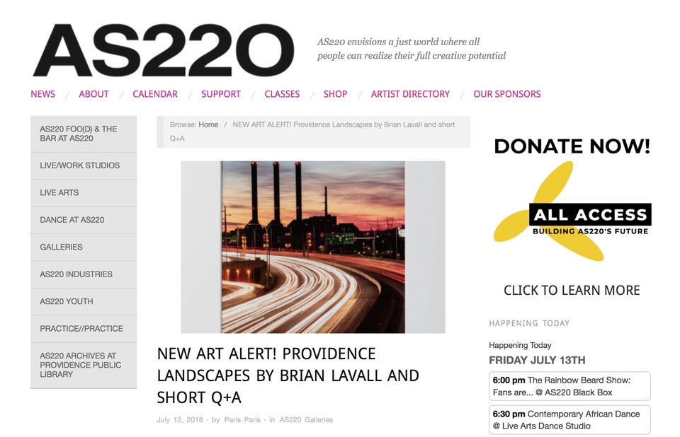 I’m excited I can finally share this news! Three of my photographs, "Iway Sunset Light Trails", "Blackstone River Black and White", and "Point Street Skyline at Blue Hour" are now being featured in the AS220 Galleries Flat File Project.