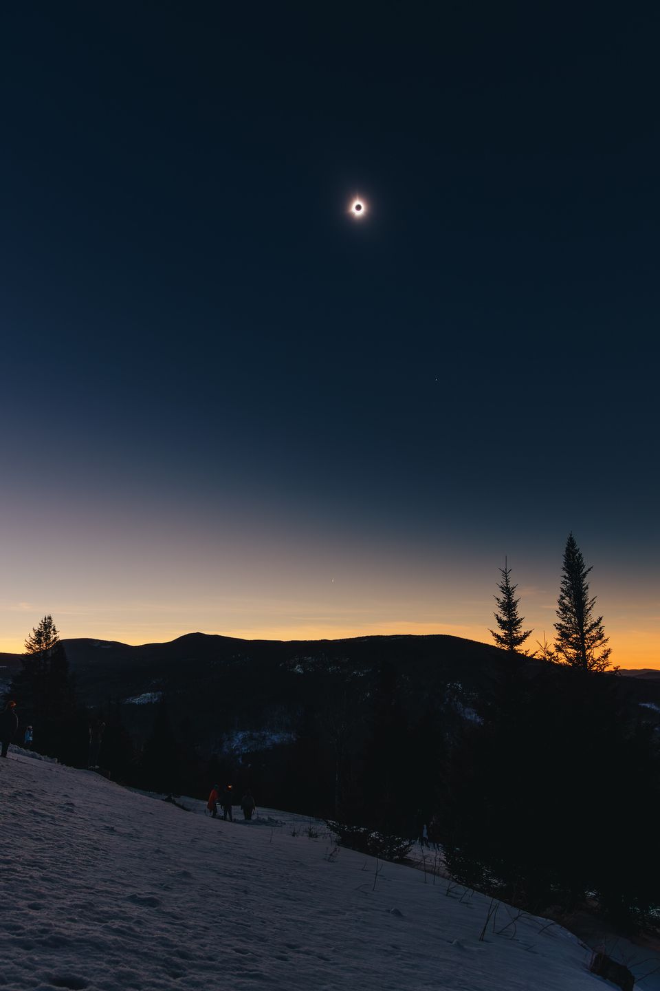 During totality, the moon covers 100% of the sun, allowing us to see the sun's atmosphere, which appears as a glowing ring in the sky. From our vantage point, we were able to look out over the mountains and valley to see the edge of the shadow, appearing as a 360 degree sunset around us. Venus, seen below the sun and moon, and Jupiter (out of frame) were also visible during the two and a half minutes we were in the shadow.