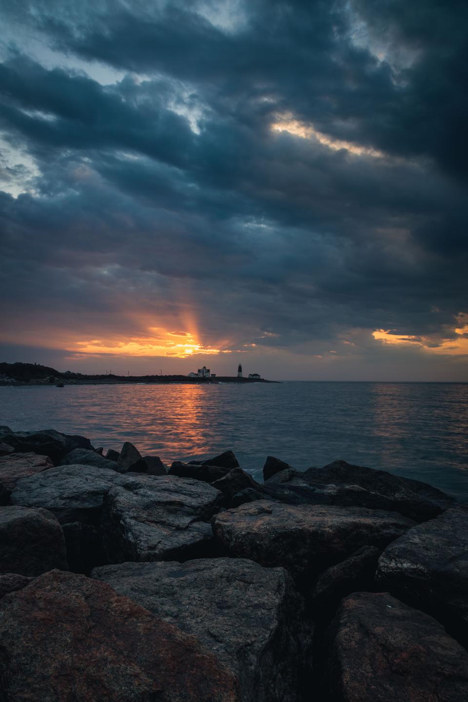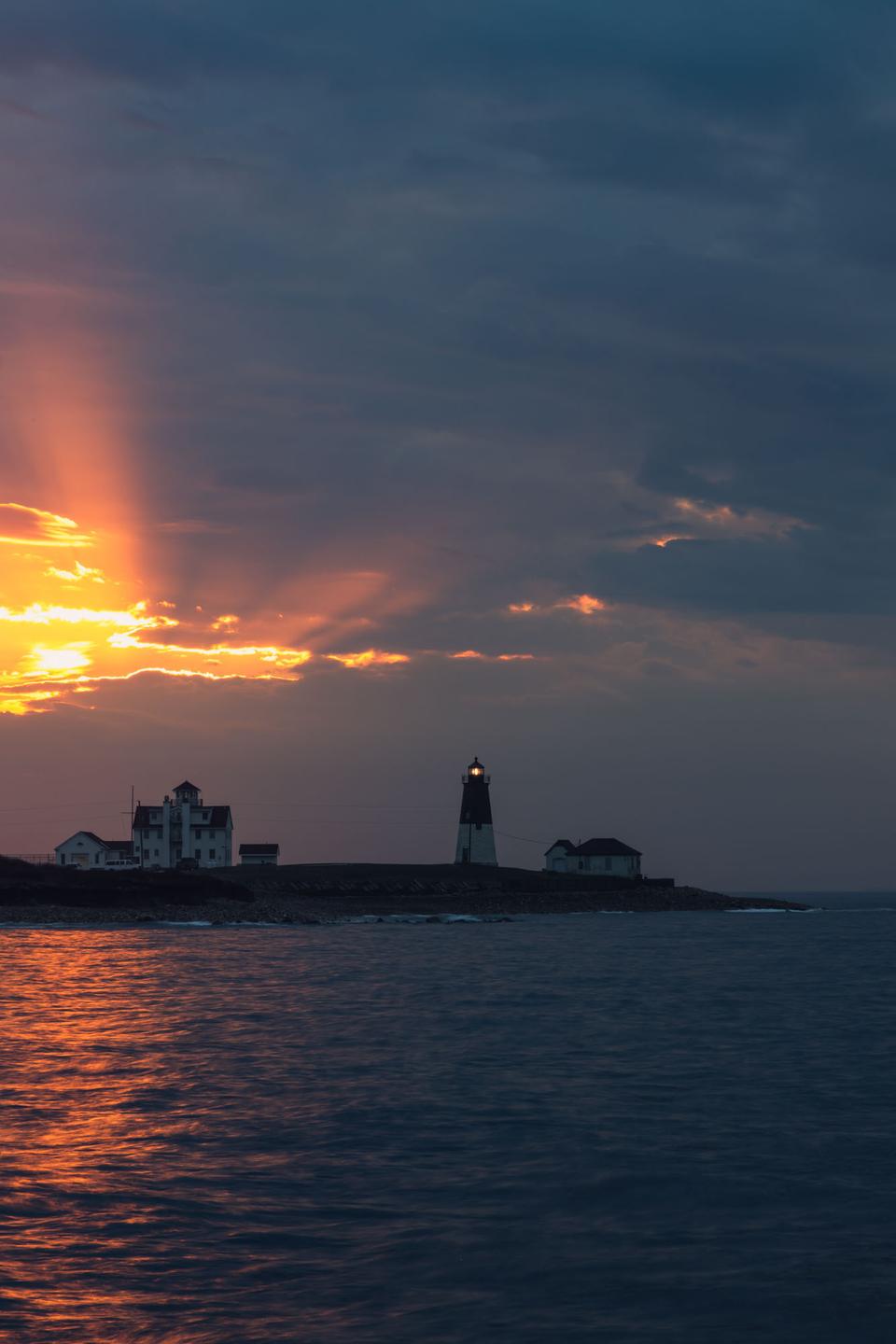 I arrived at Point Judith a few minutes before the 6:33 a.m. sunrise to mostly clouds. As I started to set up my gear and the sky continued to brighten, rays of sunlight began to appear through a few gaps in the clouds. But would the sun actually line up?